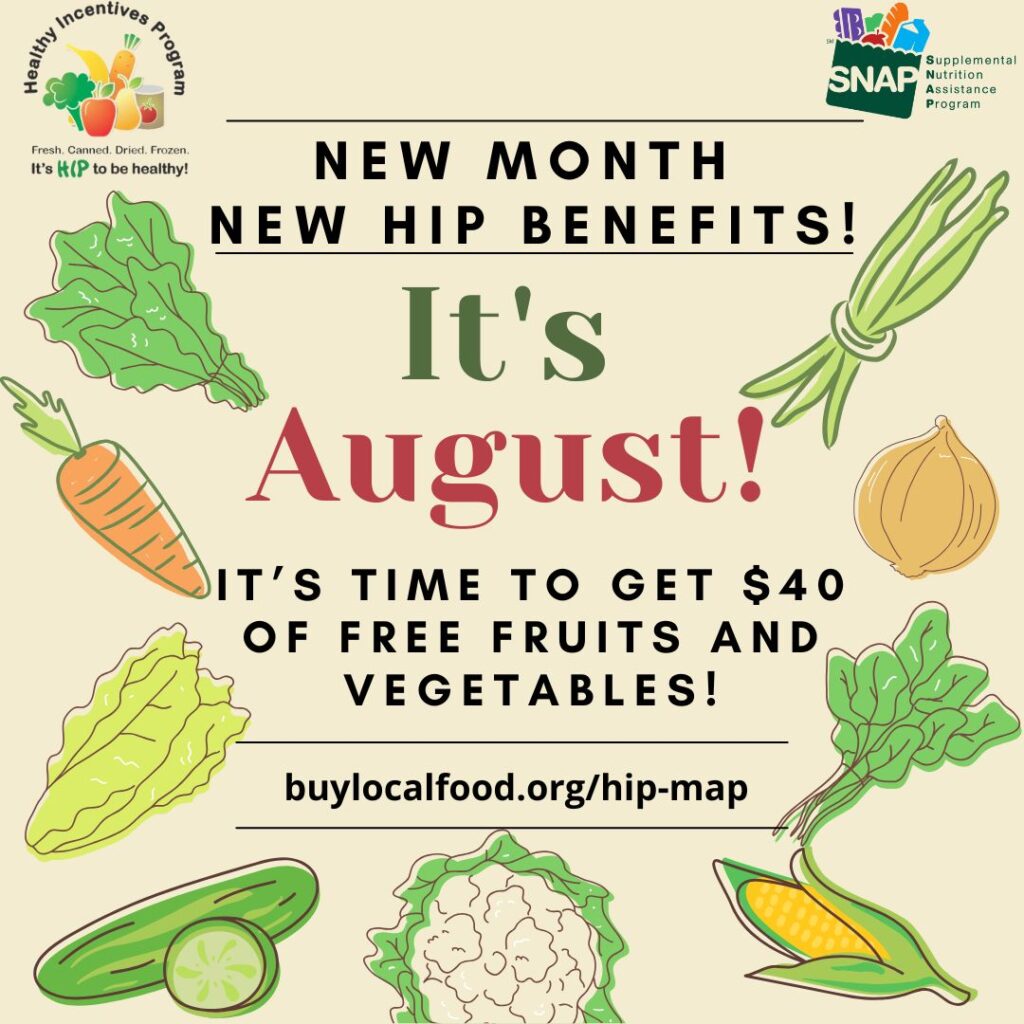 HIP can also be used to make monthly payments at some Community Supported Agriculture farms (find them listed in the printable HIP location list). Many summer CSAs are still taking sign-ups!