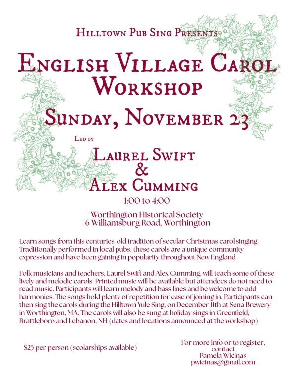 In addition to the November pub sing, We’d like to remind folks about the English Village Carol Workshop on Sunday November 23rd from 1 to 4. Laurel Swift and Alex Cumming will be leading us in these wonderful songs.