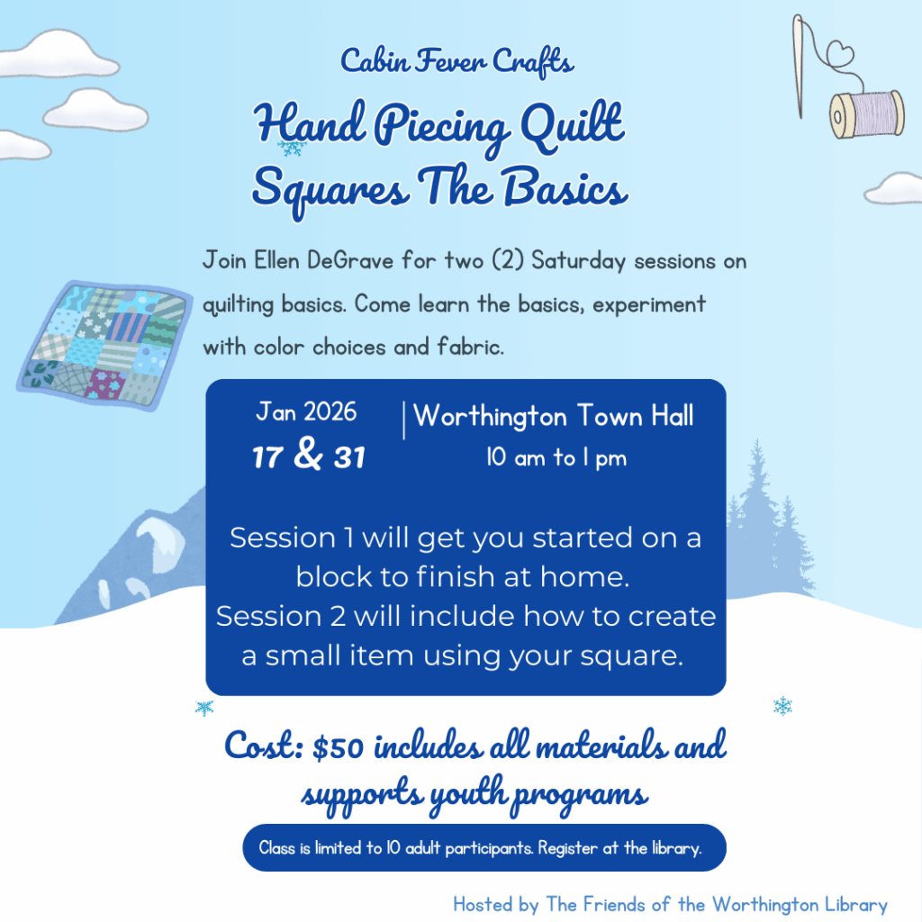 Join Ellen DeGrave for two (2) Saturday sessions at the Worthington Town Hall on January 17 and 31, 2025 from 10 am to 1 pm. Come learn the basics, experiment with color choices and fabric.